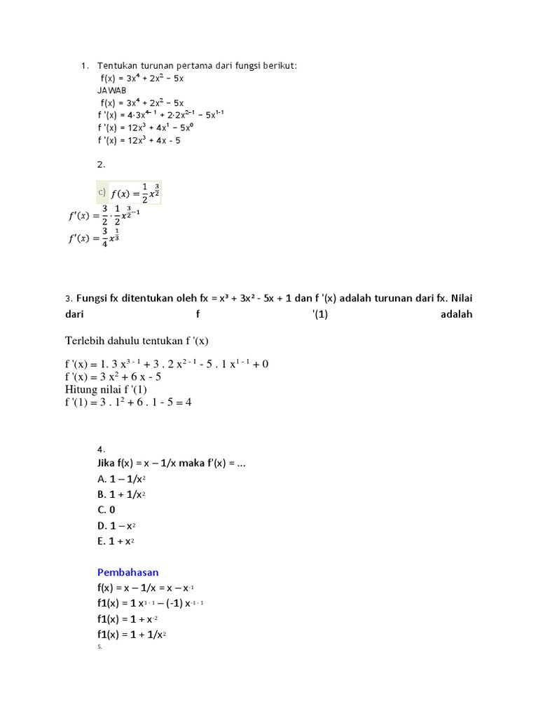 Turunan from imgv2-1-f.scribdassets.com Play this game to review undefined. Definisi turunan jika fungsi y = f(x) yang kontinu pada suatu interval maka turunan ( deferensial ) dari y terhadap x didefinisikan sebagai : Pembahasan dengan aplikasi turunan berantai maka untuk y = sin (2x + 5) y ' = cos (2x + 5) ⋅ 2 ↑ angka 2 diperoleh dari menurunkan 2x + 5 y' = 2 cos (2x + 5). Turunan adalah pengukuran terhadap bagaimana fungsi berubah seiring perubahan nilai yang dimasukan, atau secara umum turunan menunjukkan bagaimana suatu besaran berubah akibat perubahan besaran lainnya. Tulis suku banyak sebagai fungsi dari. C tgh x ; Turunan () = 3 2 + 5 − 6 adalah …. Turunan fungsi aljabar merupakan fungsi lain dari suatu fungsi sebelumnya, sebagai contoh fungsi f menjadi f' yang memiliki nilai tidak beraturan.